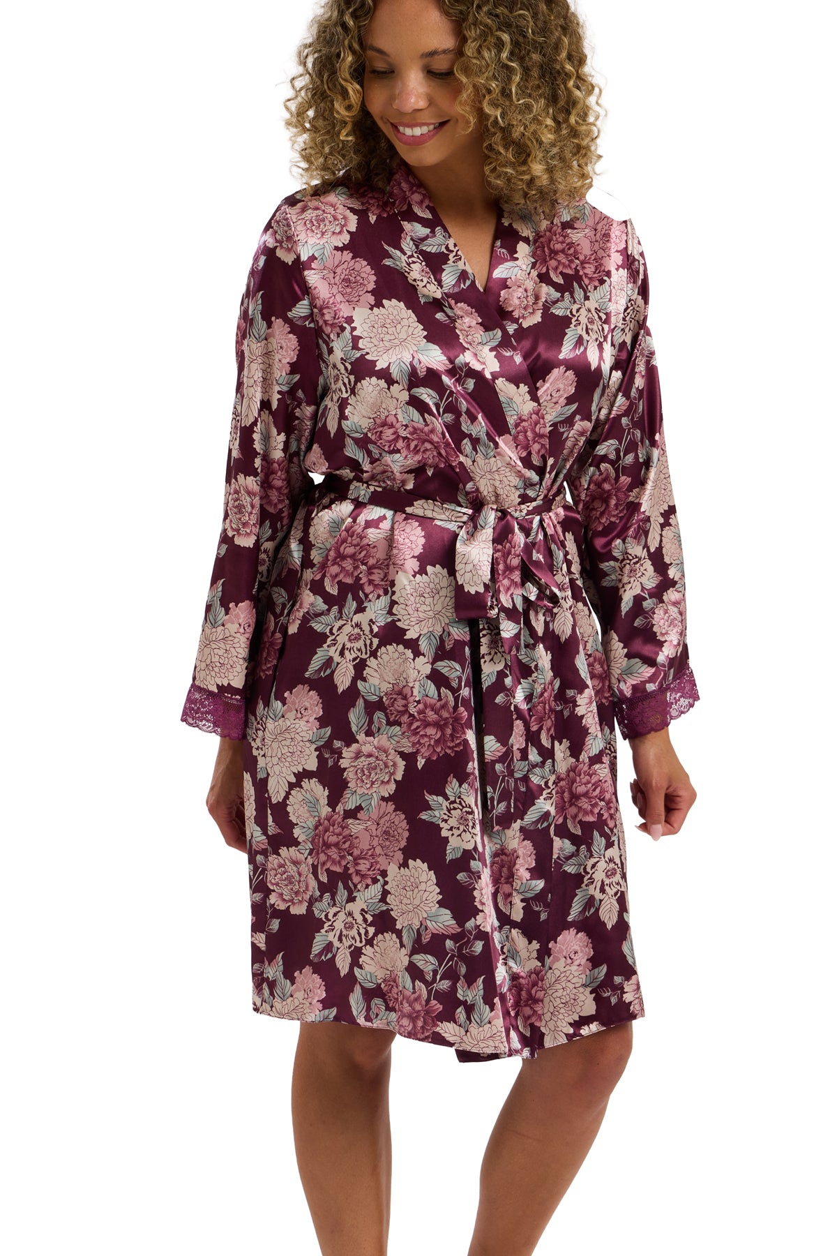 This versatile piece is perfect paired with our Lizette satin and lace chemise or worn as an elegant getting-ready look for special occasions. Featuring a self-fabric belt and practical side pockets, Lauren comes in two flattering colourways with a beautifully detailed large floral print.