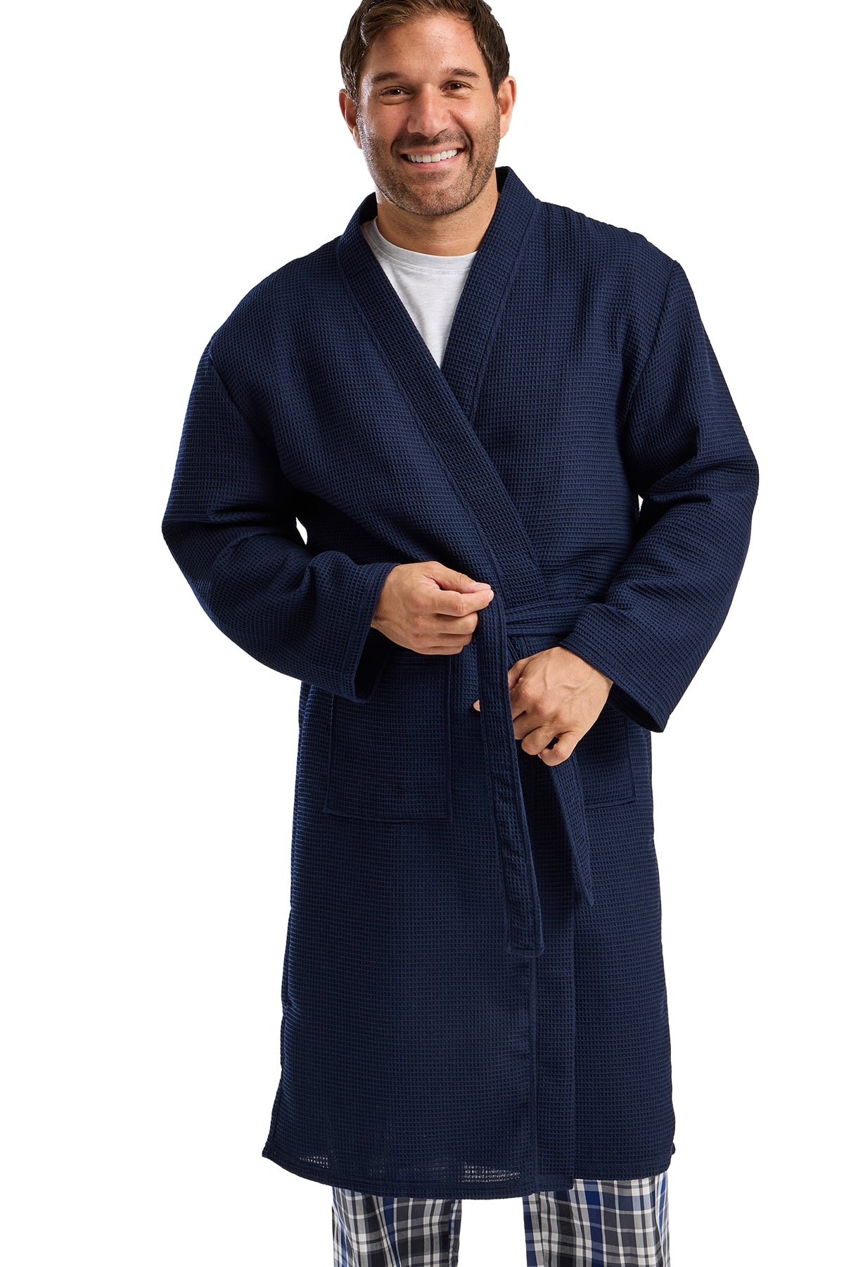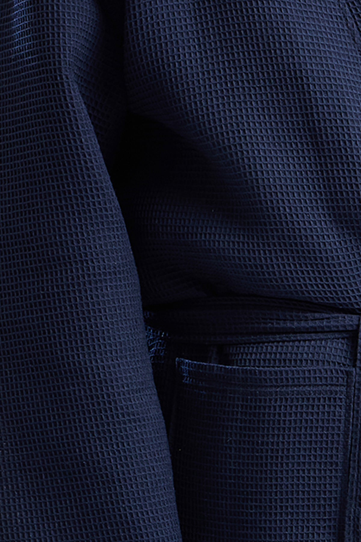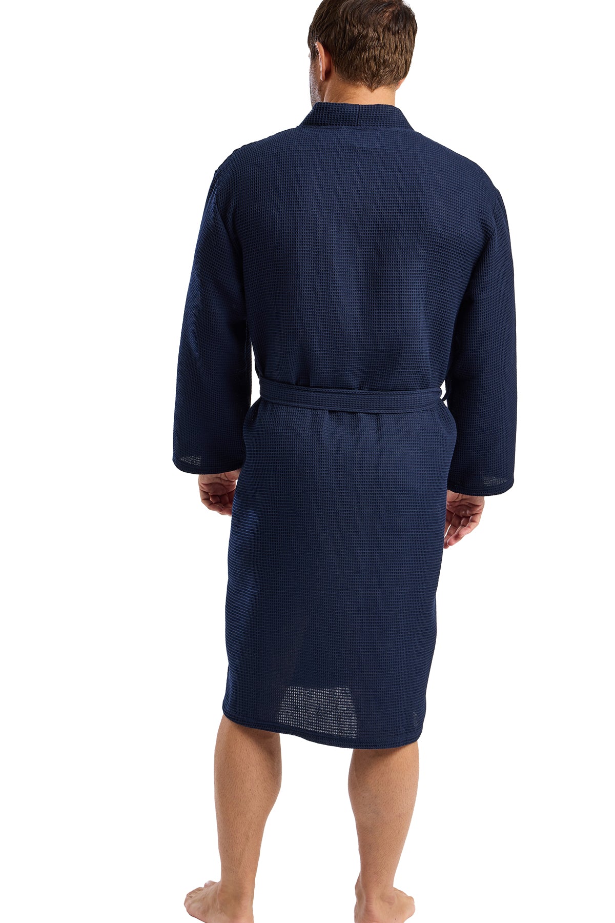 Made from soft, breathable cotton with a textured waffle finish, it’s like bringing the spa home - ideal for post-shower lounging or slow starts to the day. With a sleek kimono-style neckline, the lightweight fabric keeps things cool and comfy. Featuring a secure tie belt, internal ties for a custom fit, and two deep pockets for essentials, it’s practical too. Finished in timeless navy, it’s a thoughtful gift he’ll actually use.